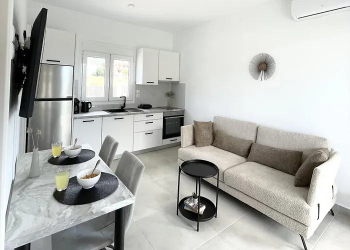 Oprócz udogodnień do samodzielnego przygotowywania posiłków, takich jak wyposażony aneks kuchenny, obiekt w Karavádhosie oferuje także jadalnię na świeżym powietrzu. Kuchnia wyposażona jest w czajnik elektryczny, lodówkę i przybory kuchenne. Goście mogą zjeść posiłek w odległości 5-minutowego spaceru stąd w restauracji Happiness.